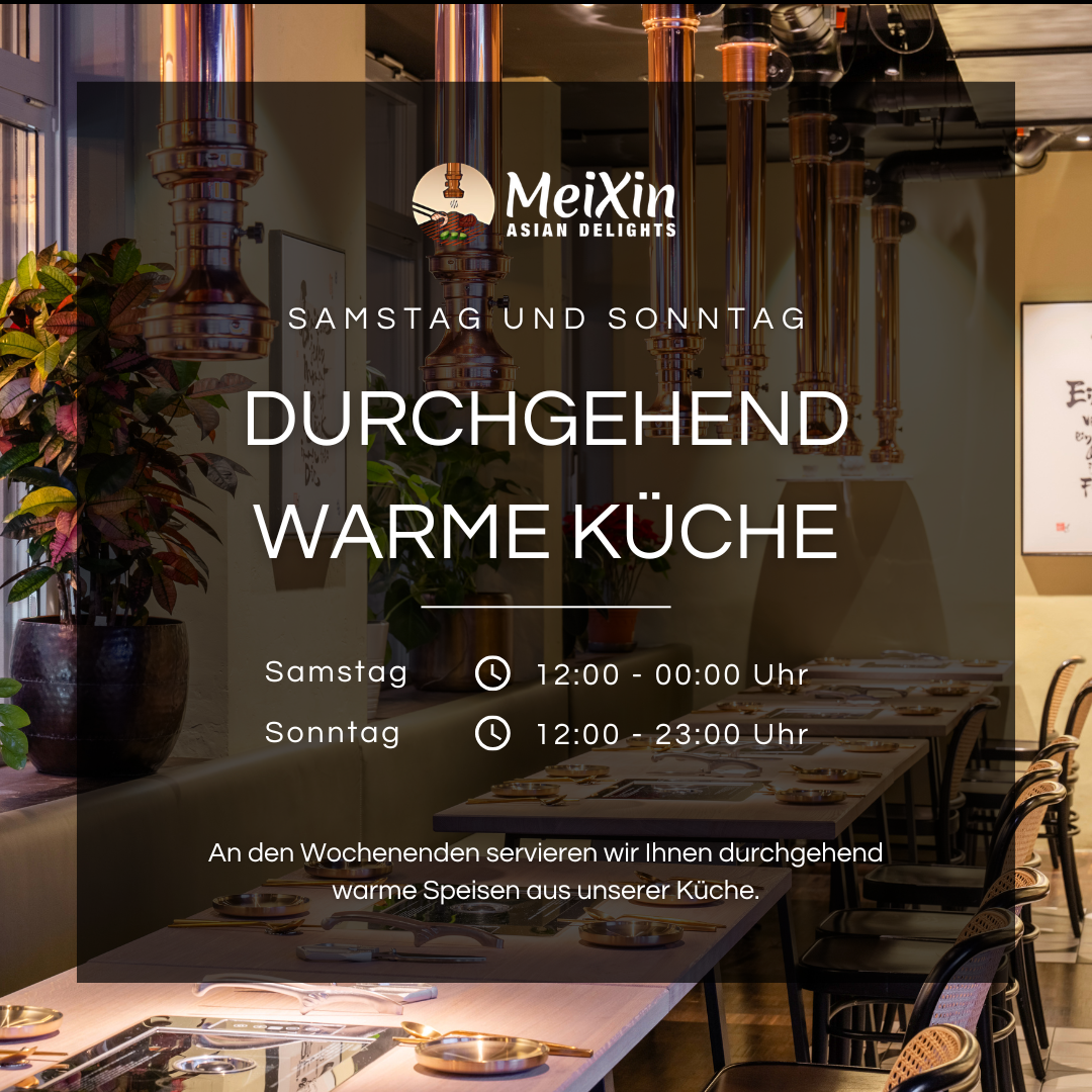 MeiXin steht für moderne asiatische Esskultur auf höchstem Niveau. Unser Anspruch ist es, kulinarische Erlebnisse zu schaffen, die durch Qualität, Authentizität und Ästhetik überzeugen.